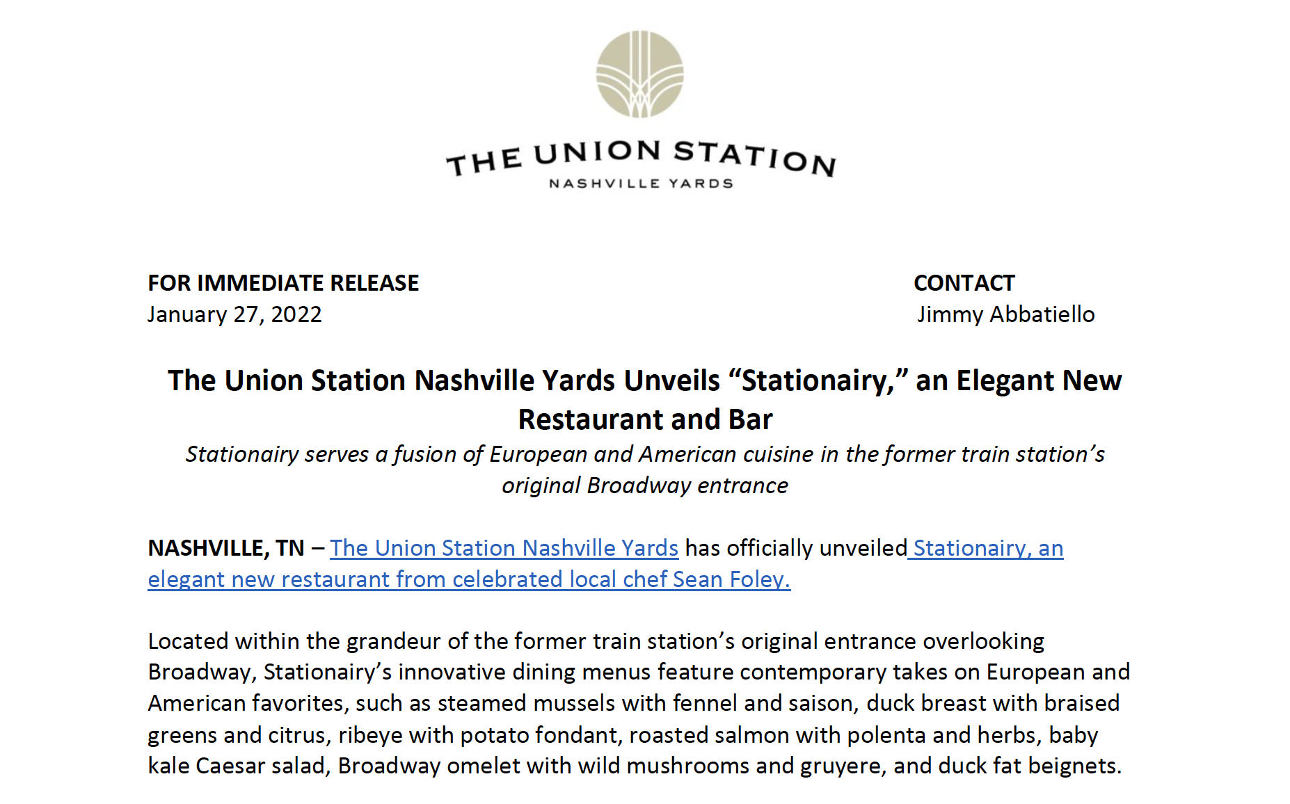 “The Union Station Nashville Yards Unveils “Stationairy,” an Elegant New Restaurant and Bar” For The Union Station Nashville Yards, Autograph Collection