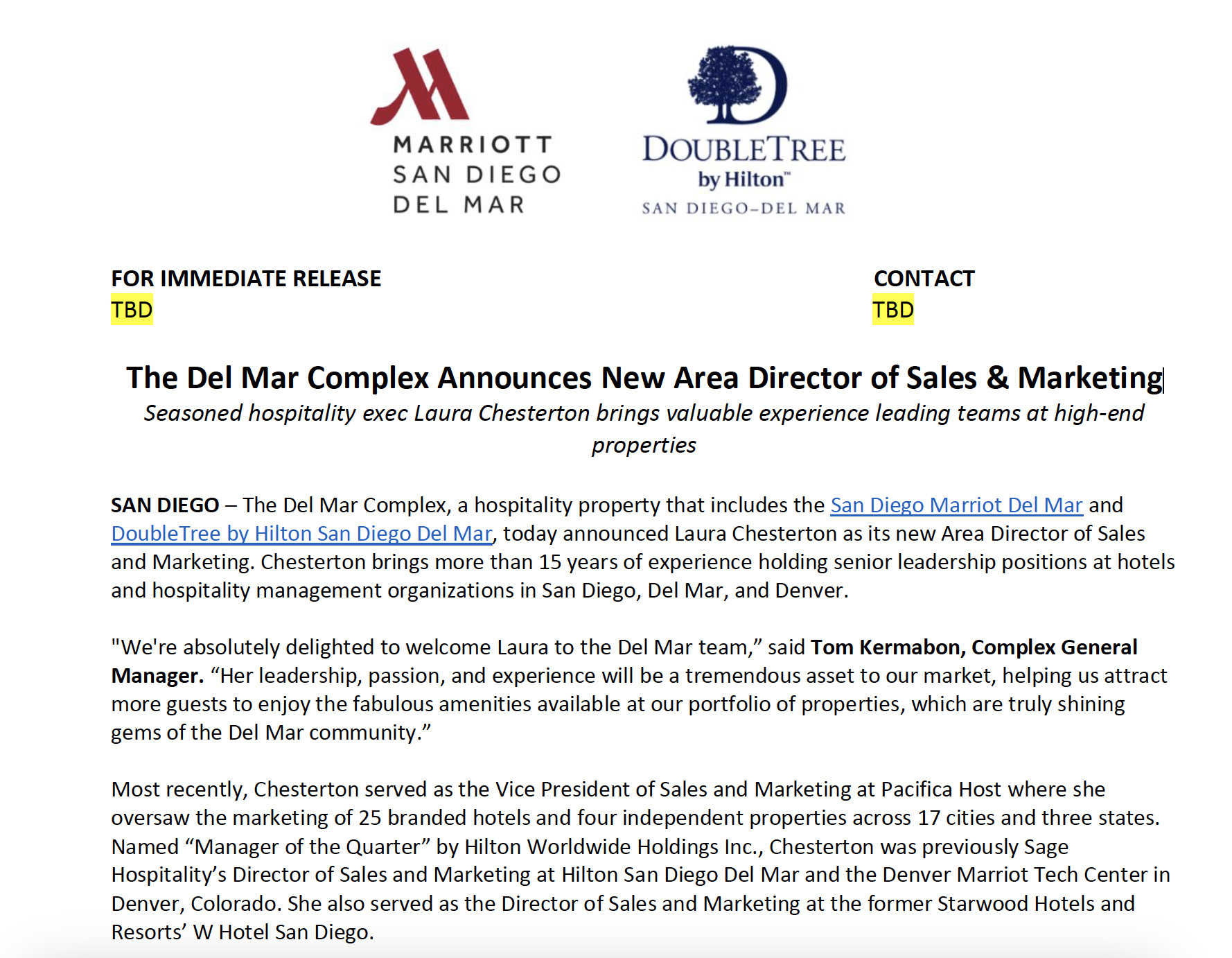 “The Del Mar Complex Announces New Area Director of Sales & Marketing” For The Del Mar Complex